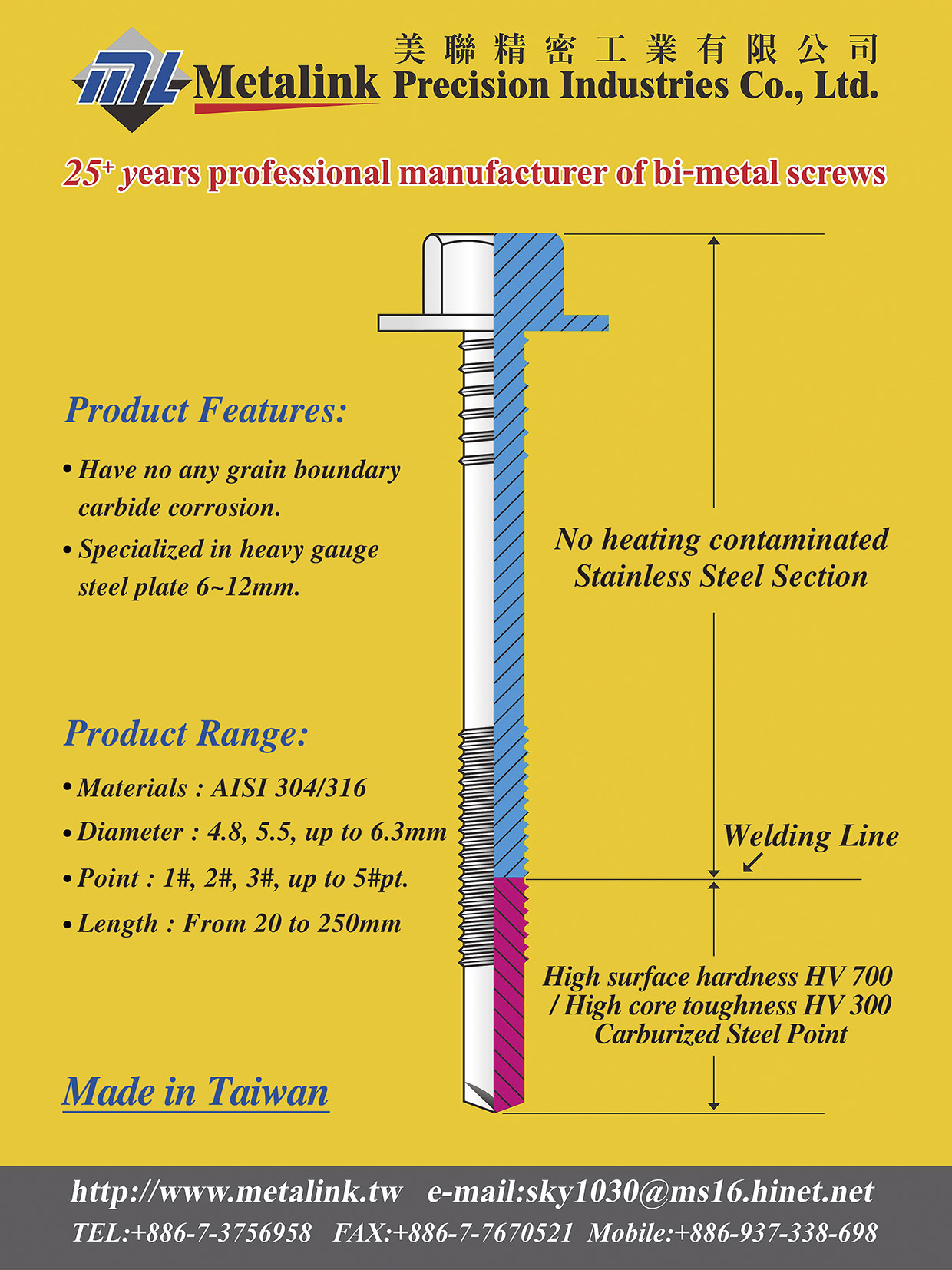 美聯在奧斯田鐵系不銹鋼與滲碳鋼複合自攻與自鑽螺絲製造領域獲得世界各國專利局的多項專利,肯定我們在複合金屬螺絲的領域具有卓越的創新能力與技術成就。